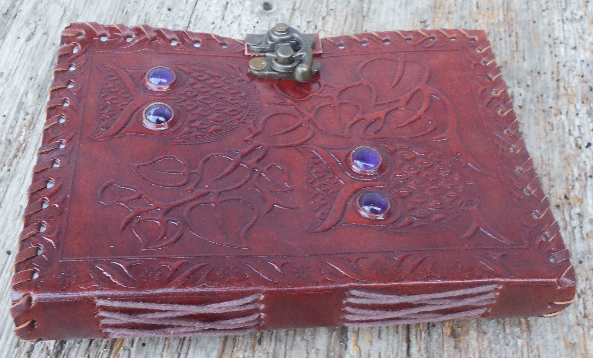 Einband: braunes Leder. Die Vorderseite zeigt zwei Eulen, mit Amethyst-Steinen als Augen, die Rückseite ist reich verziert.