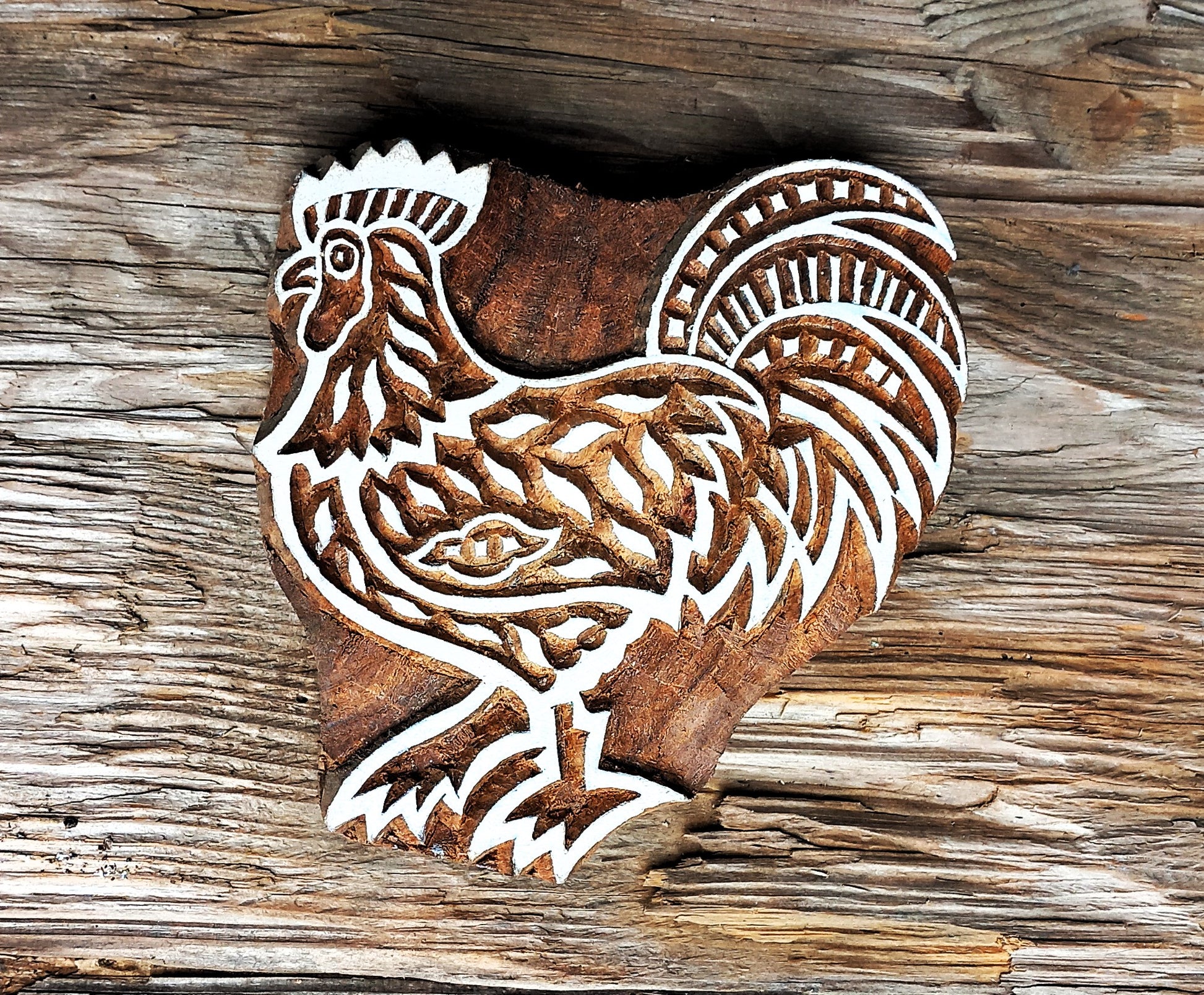 Stoffdruckstempel aus Holz in Form eines stolzen Hahns mit Blick nach links gerichtet.